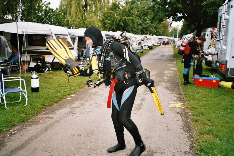 Am Samstag früh brauste ich mit meiner Freundin Nina und einem voll beladenen Kofferraum los zum Bodensee. Wie zu erwarten waren wir nicht die ersten am See, einige "unserer" Wohnmobile hatten auf dem Campingplatz schon Stellung bezogen. Bei starker Bewölkung bauten Nina und ich unser kurz zuvor erst erstandenen Zwei-Mann-Zelt auf und richteten uns häuslich ein. Dann verabredete ich mich mit Edgar und Christoph gleich zum ersten Tauchgang. Wir richteten unsere Ausrüstung zusammen und ich zwängte mich in meinen 7mm Halbtrockenanzug. Gut, dass Christoph auch "nur" in einem Nasstauchanzug tauchte, so hatte ich gleich einen "Verbündeten", falls es mir während des Tauchgangs zu kalt werden sollte und einer von uns das Zeichen zum Umkehren geben sollte. Edgar war ja im Trocki unterwegs und würde wohl als letzter zu frieren anfangen.