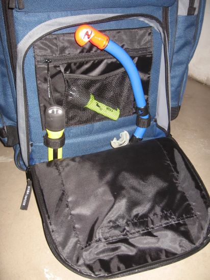 Die obere, kleinere Vortasche ist gepolstert. Damit man die Größe besser abschätzen kann, habe ich auf dem Bild beispielhaft einen Schnorchel und eine Tauchhandlampe reingesteckt.