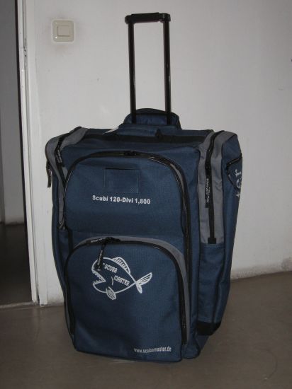 Durch die breiten Schultertragegurte auf der Rückseite kann die Tauchtasche auch wie ein Rucksack auf dem Rücken getragen werden. Das ist dann praktisch, wenn das Tauchequipment über unwegsames Gelände transportiert werden muß, über Stock und Stein, evtl. an einem Strandabschnitt, an dem die Skaterrollen ansonsten im Sand einsinken würden, oder wenn er auf ein Tauchschiff getragen werden muß.