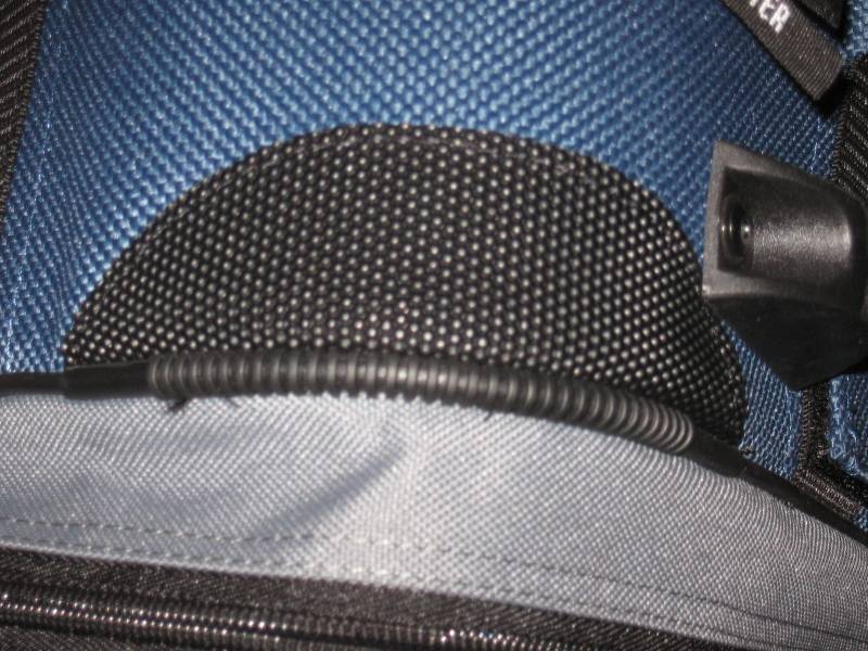 Bei Nichtgebrauch verschwinden die Rückentragegurte unter der Rückenplane mit Klettverschluß. Das ist insbesondere bei Flugreisen praktisch: Beim Einchecken verstaue ich die Rückentragegurte unter dieser Abdeckung, da sich ansonsten die losen Enden der Gurtbänder in die Ritzen der Förderlaufbänder einklemmen könnten. Das ist mir einmal vor Jahren am Flughafen passiert, darauf hin stand das ganze Förderband still, und ein Techniker wollte schon die Gurte an meinem Rucksack durchschneiden. Seitdem bin ich für dieses Thema sensibilisiert.