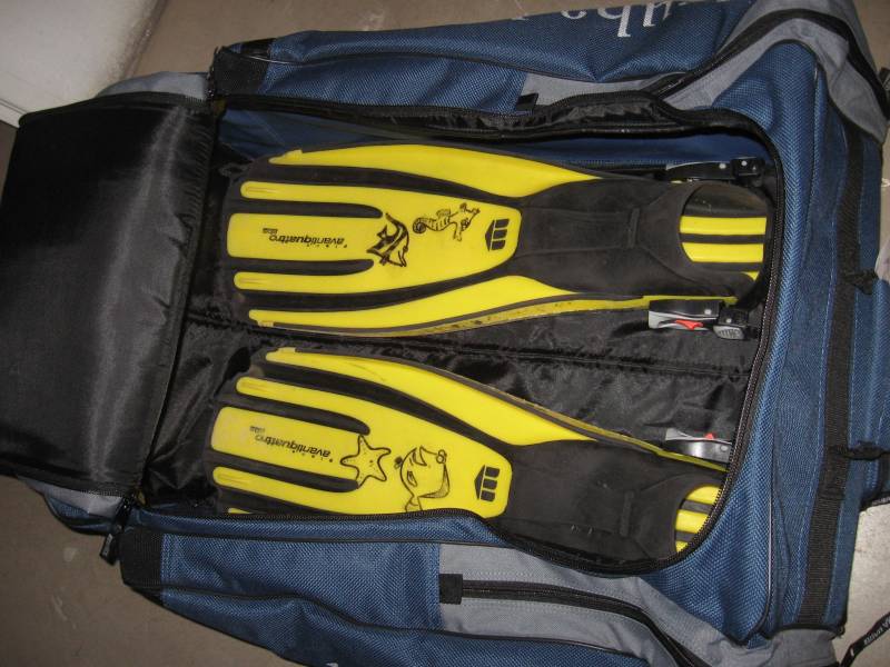 Zu guter letzt habe ich noch drei Bilder der Haupttasche eingefügt. Zur Größenabschätzung habe ich einmal ein Zollstock und bei den anderen Bildern meine Mares Avanti Quattro-Flossen reingelegt.